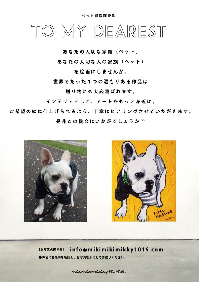 あなたの大切な家族(ペット) あなたの大切な人の家族(ペット) を絵画にしませんか。 世界でたった1つの温もりある作品は 贈り物にも大変喜ばれます。 インテリアとして、アートをもっと身近に。 ご要望に沿えるよう、丁寧にヒアリングさせて頂きます。 お家時間が増えた方も沢山いらっしゃるかと思いますので、 絵でほっこりと安らげる空間に 生活に彩りを加えてみてはいかがでしょうか。 価格は55,000円〜 となっておりますが、F0、S0サイズの価格となります。 F0、S0サイズ以外をご希望のお客様は、お客様専用ページでご購入が出来るように致しますので、お問い合わせにてご連絡頂きますようお願いいたします。 ⚫︎ 作品サイズ:F0サイズ( 180×140mm ) 〜 その他のサイズをご希望の方はメッセージいただければ対応致します。 ⚫︎ オリジナル原画 / 肖像画 ⚫︎ 額装なし(木枠付きキャンバスなので、豆ピンなでそのまま飾れます) ⚫︎ 別途送料がかかります。ご了承ください。 / / / [ ご注文の流れ ] ① ご注文時に下記内容を備考欄にご記入ください。 【作品制作において確認事項】 ⑴ ペットの色味について、どちらで描くかご記入ください 本来の色で仕上げたい or おまかせ ⑵ 背景色にご希望があればご記入ください。 赤 オレンジ系 や おまかせなど ※ こんな感じで!と私の作品の中の絵を写メしていただいても構いません。 ⑶ お名前や記念日等を入れたい場合はご記入ください。 アルファベット、カタカナ、ひらがな、漢字も可能です。 ⑷ 縦仕様 or 横仕様 どちらで描くかご記入ください。 ⑸その他ご要望がございましたら、 ご記入ください。 ② ご注文内容を確認し、返信メールにてヒアリング、確認をさせていただきます。 ③ 内容確定後1ヶ月から2ヶ月ほどで作品の報告をいたします。 (写真をとってメールいたします) こちらで問題ない場合は、発送となります。 / 【ご注文のご注意】 ●作品を忠実に仕上げる為、鮮明な写真をご用意ください。 携帯内に保存されている写真でも可能ですが、画像が荒い場合は細かい部分の保証出来ませんのでご注意ください。 ●作品は写真を模写致しますので、仕上がるキャンバスのサイズを想像しながらお選びください。 長方形・正方形・縦仕様・横仕様など ※ご注文時にお写真がお決まりでない場合、お送りいただき次第こちらでご提案させていただきます。 ●顔が大きく描く方が、インパクトがあり可愛く仕上がります。写真選びのご参考にしてください。 ●キャンバスのサイズが大きいほど細い部分を忠実に描くことが可能です。(目の光など) ●ギフト用のラッピングは行えませんのでご了承ください。 【納期について】 1ヶ月〜2ヶ月ほど サイズや枚数、その都度の状況によって異なります。 いつまでに欲しいという要望がございましたら、備考欄に記入お願い致します。 出来る限り対応させていただきます。 【お写真の送り先】 [email protected] ●件名にお名前を明記し、お写真を添付してお送りください。 ●ご注文内容にご変更がある場合は、写真をお送りいただく際にご連絡くださいませ。