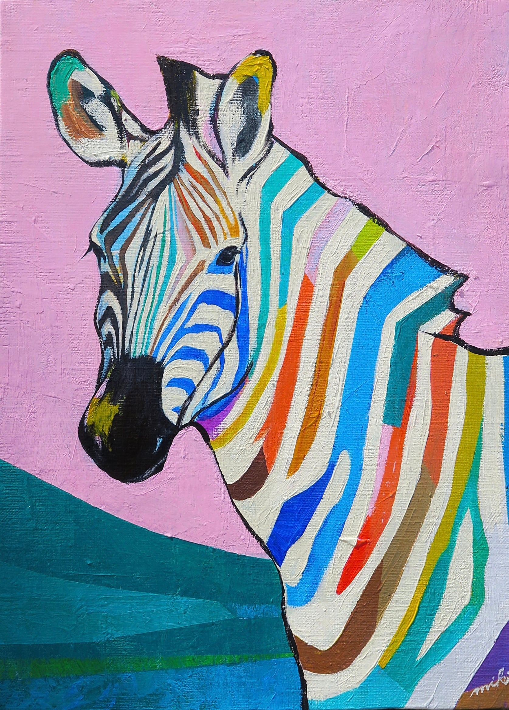 ピンクの空と雄大な草原に佇む、カラフルに彩られた模様を纏ったシマウマ。